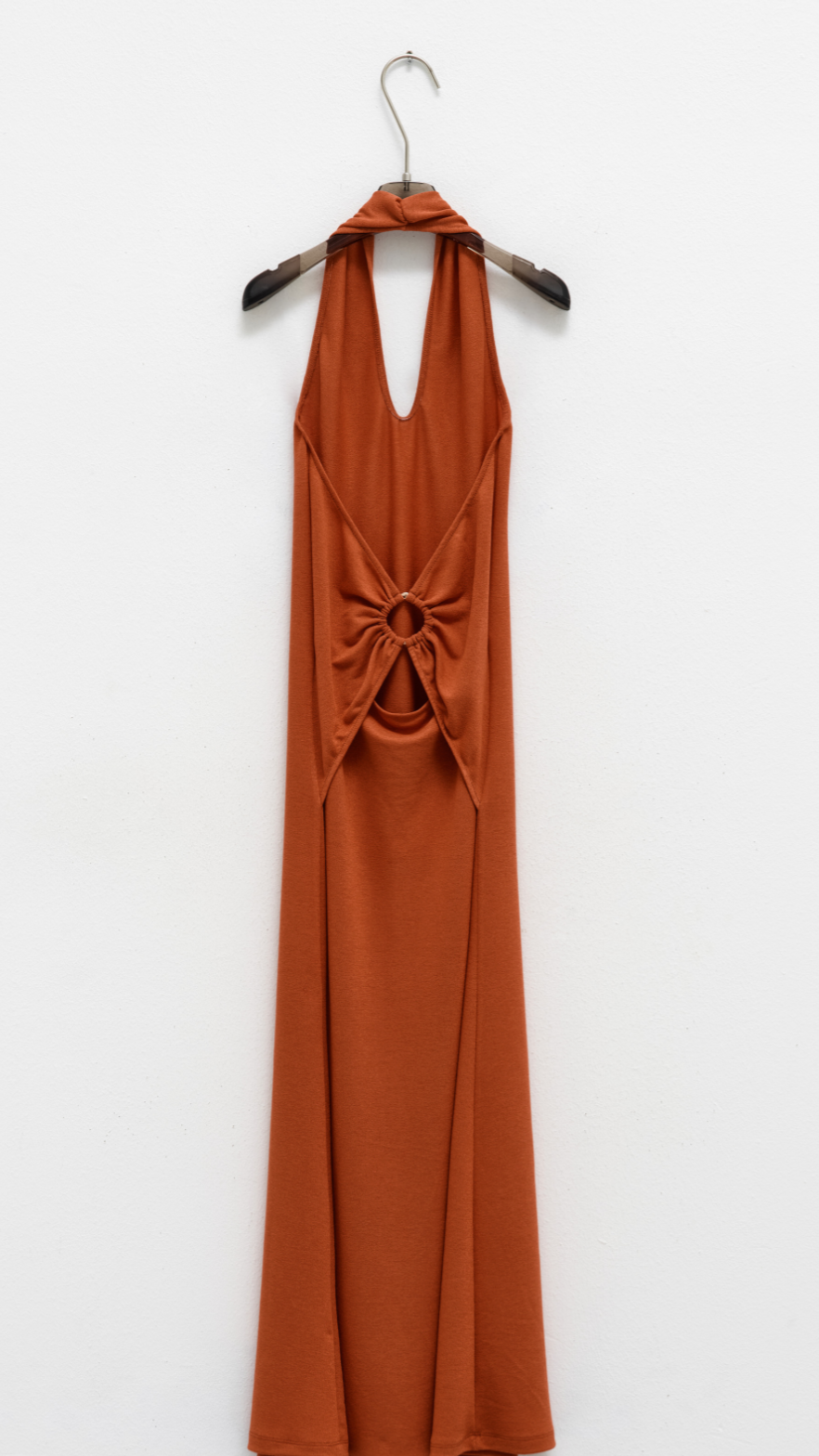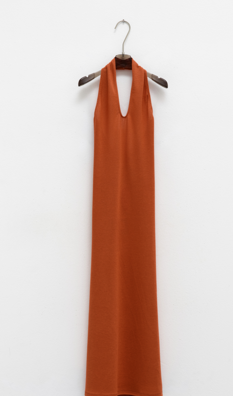Abito LUMINA lungo con scollo halter. Presenta apertura sul retro. Vestibilità morbida.