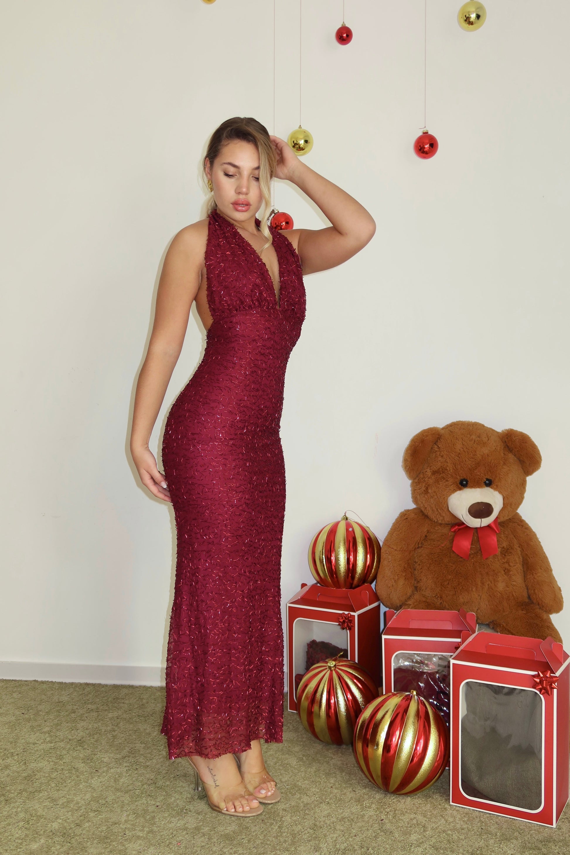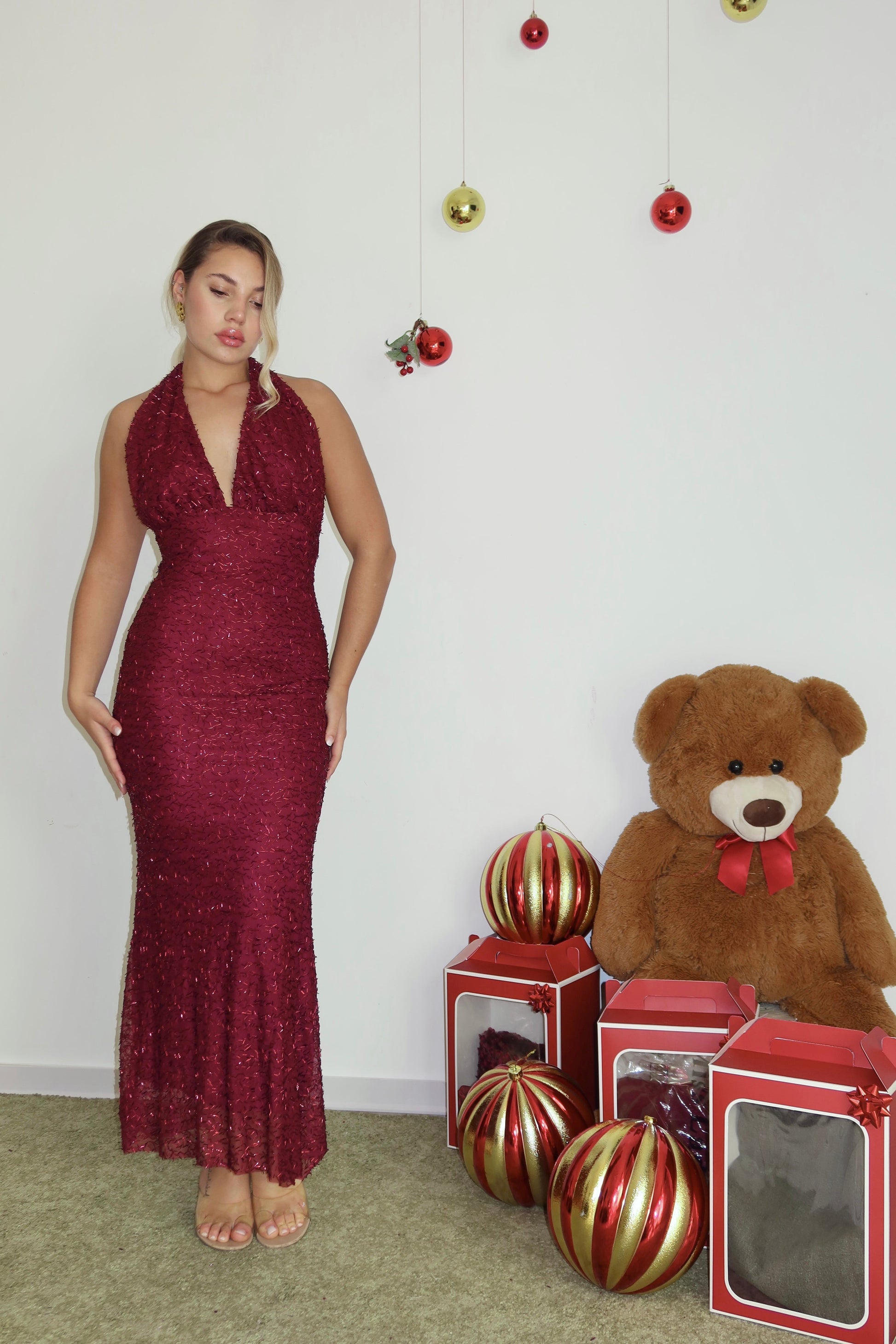 abito bordeaux scollato leggermente sul d’avanti e retro è taglia unica veste dalla xs-l , vestibilità pazzesca .