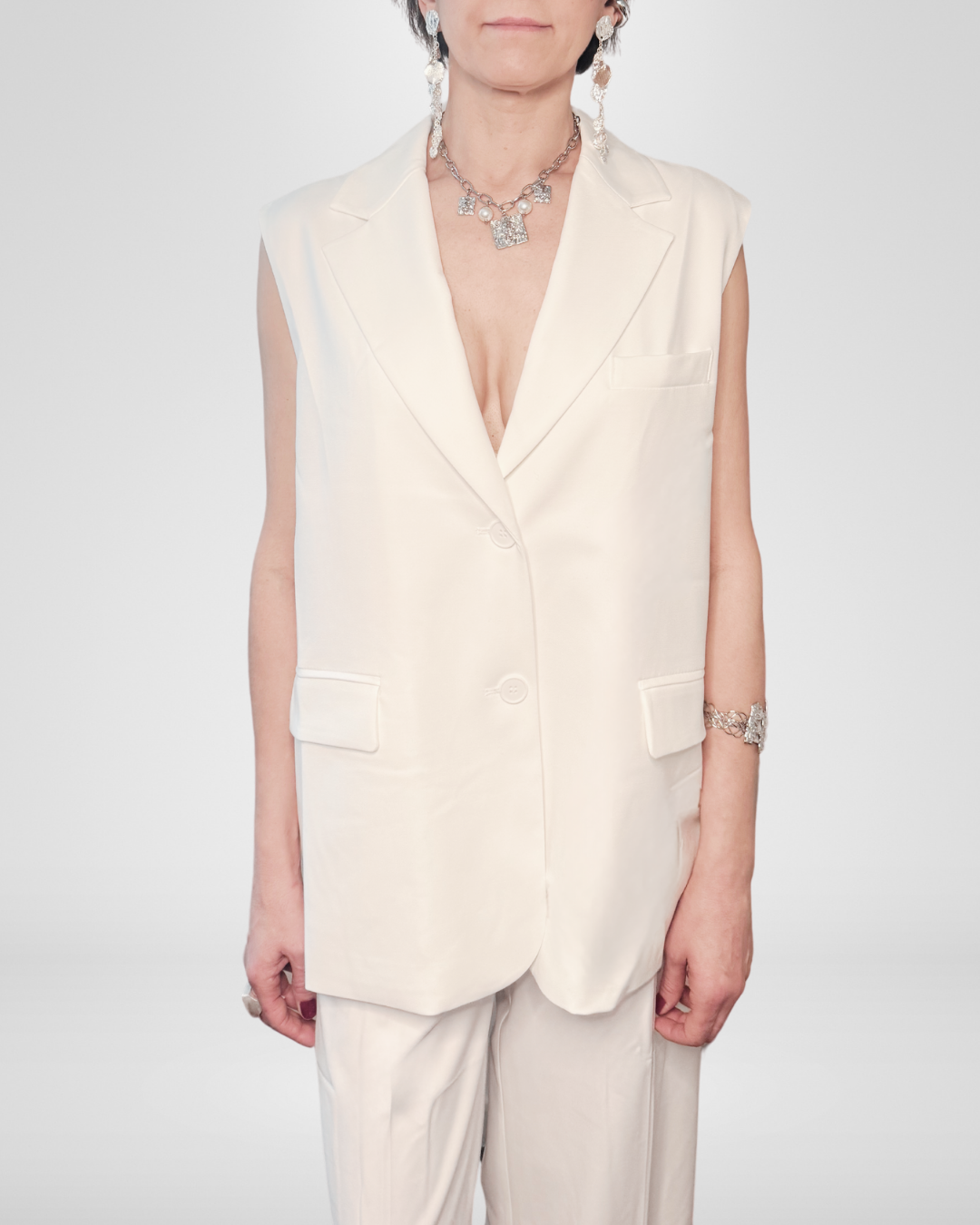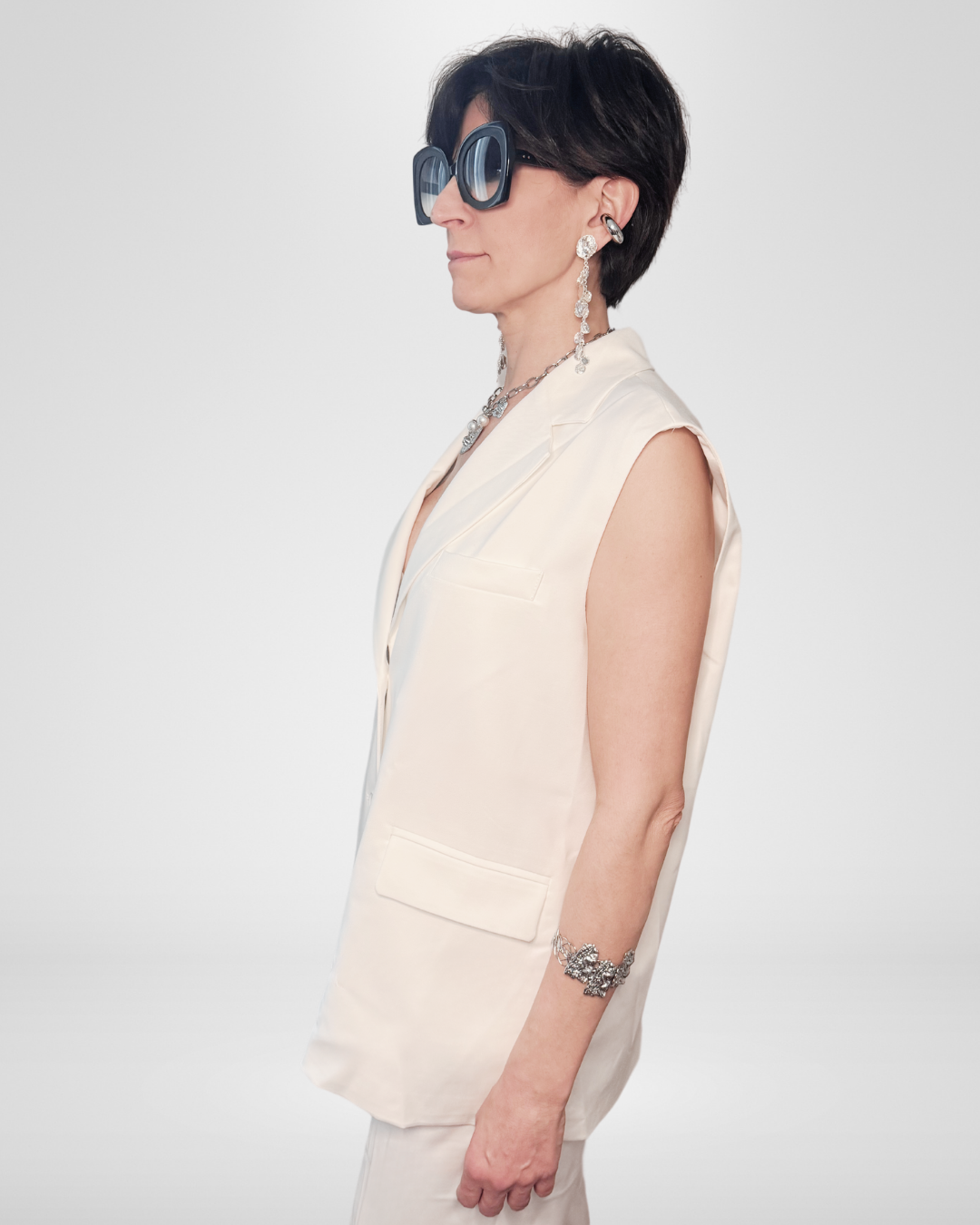 Un blazer smanicato con taglio dritto è un capo elegante e versatile, ideale per diverse occasioni. La sua struttura dritta conferisce un aspetto sobrio e raffinato, mentre l’assenza di maniche lo rende perfetto per le stagioni più calde o per essere indossato sopra una camicia o una blusa.