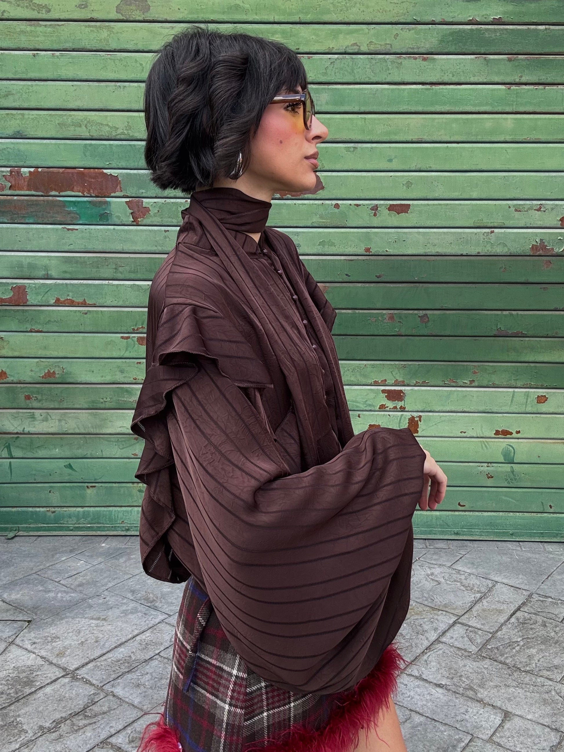 Camicia in raso, con maniche a palloncino e laccio sul collo removibile. Eleganta, raffinata e perfetta per ogni occasione.