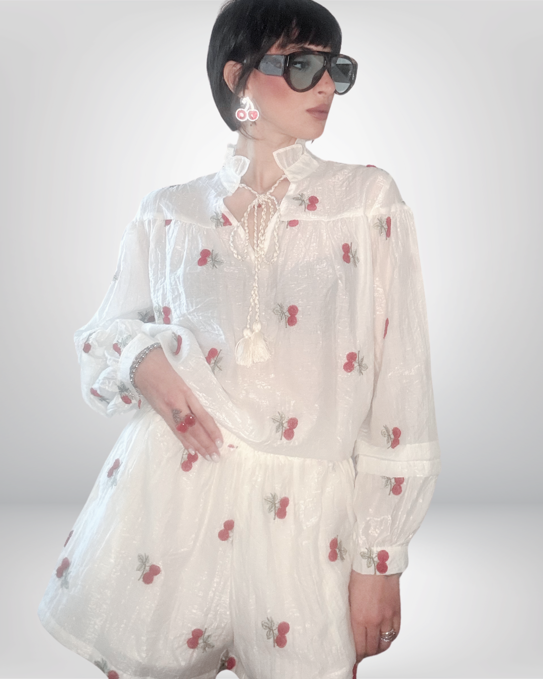 Immagina una camicia in raso che cattura subito l’attenzione grazie al suo tessuto lucido e morbido al tatto. Questa creazione sfiziosa è decorata con un vivace motivo di ciliegie che aggiunge un tocco fruttato e giocoso al capo. Le maniche pompose donano volume e movimento, conferendo alla camicia un aspetto romantico e femminile. Il collo può essere leggermente allargato, per un effetto elegante e raffinato.