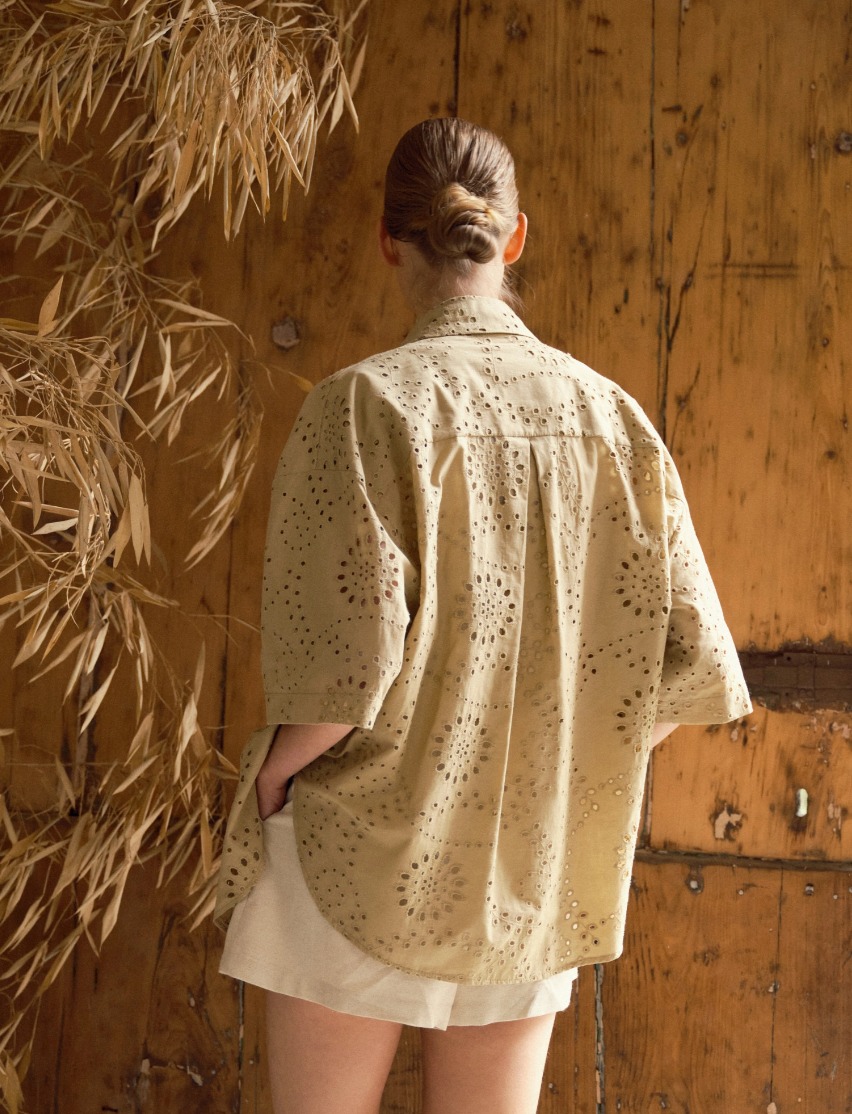 Camicia LUMINA in cotone sangallo con colletto a punta.Maniche corte. Presenta due tasche anteriori con patta.Chiusura anteriore con bottoni. Vestibilità morbida,disponibile in taglia UNICA.
