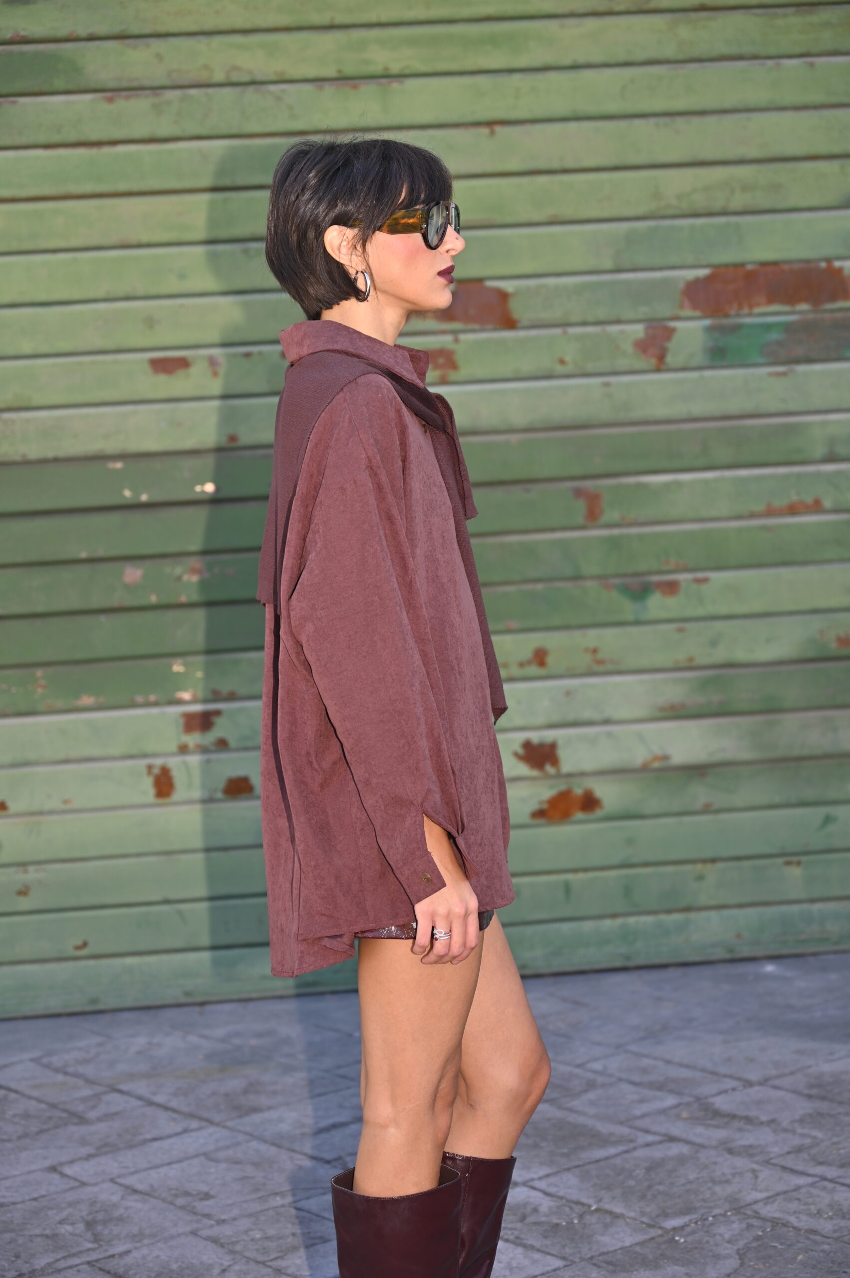 Taglio over; particolarità, oltre al suo tessuto, l'aggiunta di una piccola mantellina da appoggiare sulle spalle.