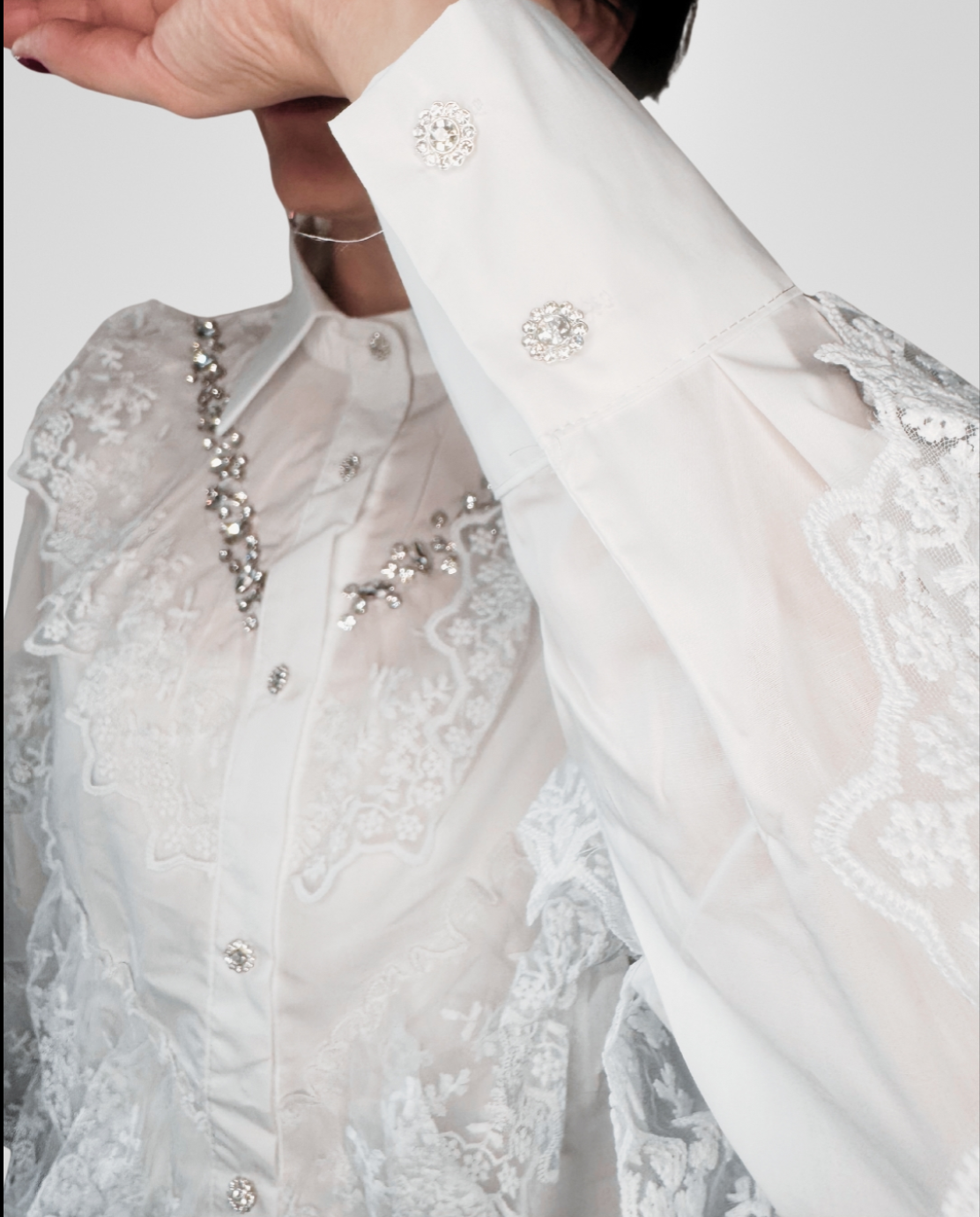 I volant in pizzo sulla parte frontale della camicia donano un ulteriore elemento di femminilità e delicatezza. Questo dettaglio in pizzo crea movimento e leggerezza, rendendo la camicia ideale per occasioni speciali o per un look più casual-chic.