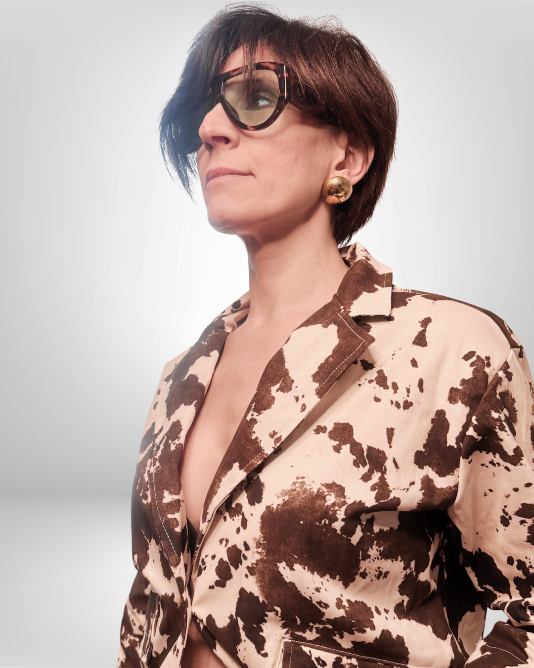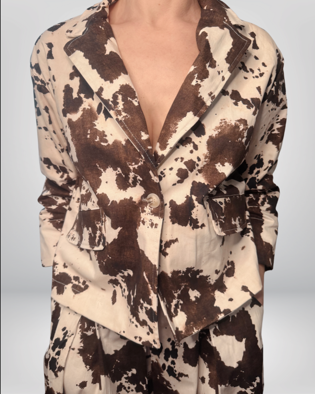 I bottoni frontali aggiungono un tocco di eleganza e praticità, consentendo di aprire o chiudere la giacca a piacere. Il design muccato, caratterizzato da un motivo a macchie, la rende unica e alla moda, attirando l’attenzione senza risultare eccessiva.