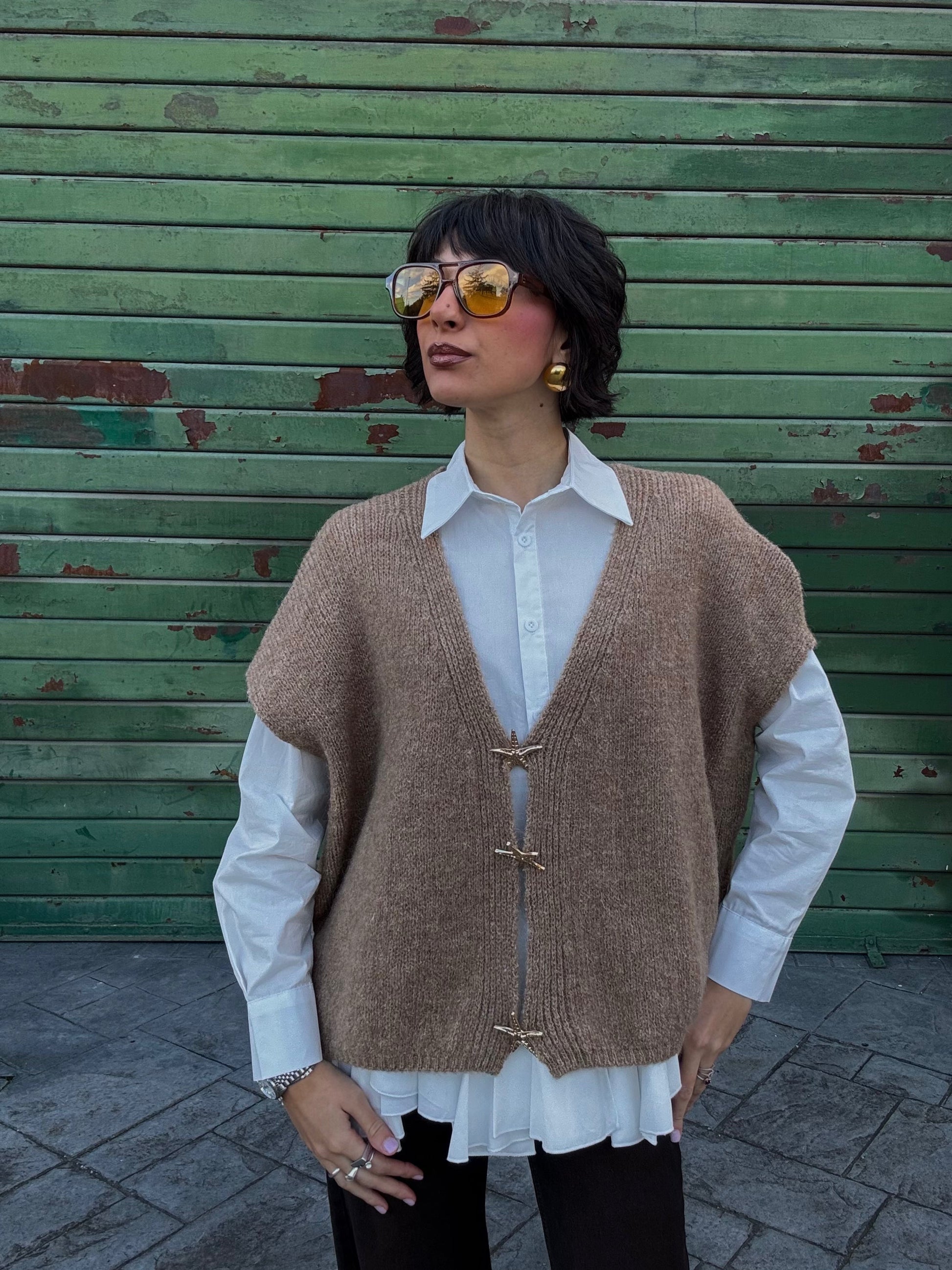 Gilet in lana con spille removibili, color oro e a forma di stella. Taglio over, super versatile.