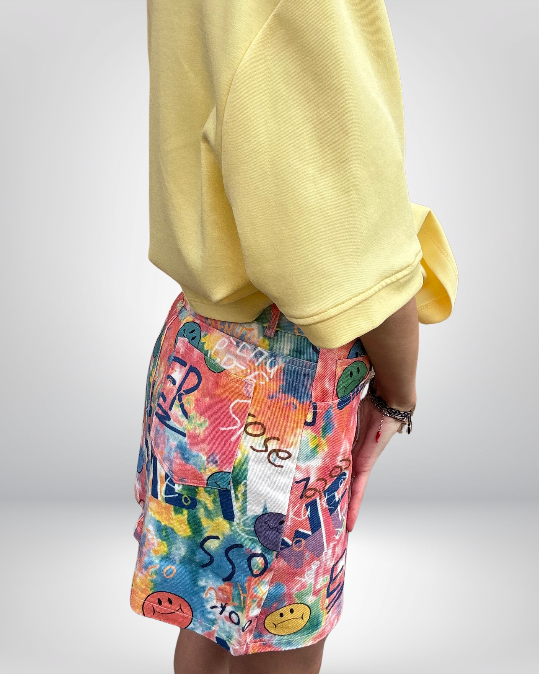 Una minigonna in cotone con smile e stampe colorate è un capo di abbigliamento vivace e giocoso, perfetto per chi desidera esprimere la propria personalità attraverso la moda. Il tessuto in cotone la rende comoda e traspirante, ideale per le giornate calde. La minigonna presenta un motivo di faccine sorridenti in vari colori, che aggiungono un tocco di allegria e spensieratezza.