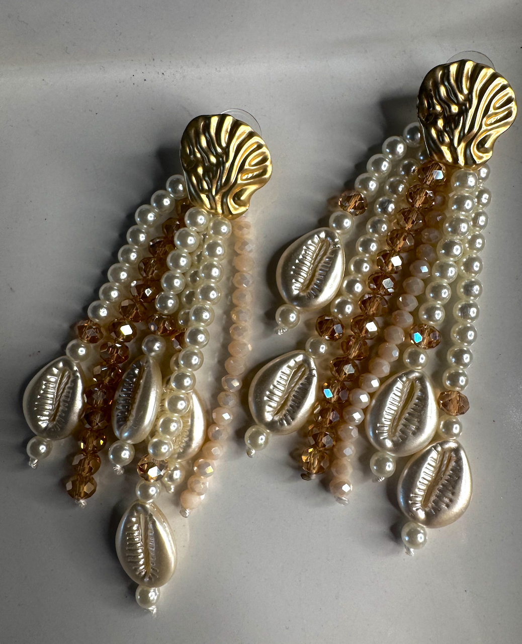 Questi raffinati orecchini a grappolo sono un incantevole connubio di eleganza naturale e stile boho-chic. Ogni orecchino presenta una cascata di piccole perle lucenti e conchiglie, collegate delicatamente tra loro per creare un effetto fluido e armonioso. Le perle, di tonalità classiche e luminose, aggiungono un tocco di sofisticatezza, mentre le conchiglie, con le loro forme organiche e colori caldi, evocano l’atmosfera del mare e della spiaggia. Ideali per un look estivo o per chi desidera portare un tocco di natura e freschezza, questi orecchini sono un accessorio versatile e affascinante, perfetto per valorizzare qualsiasi outfit con un tocco di charme naturale.