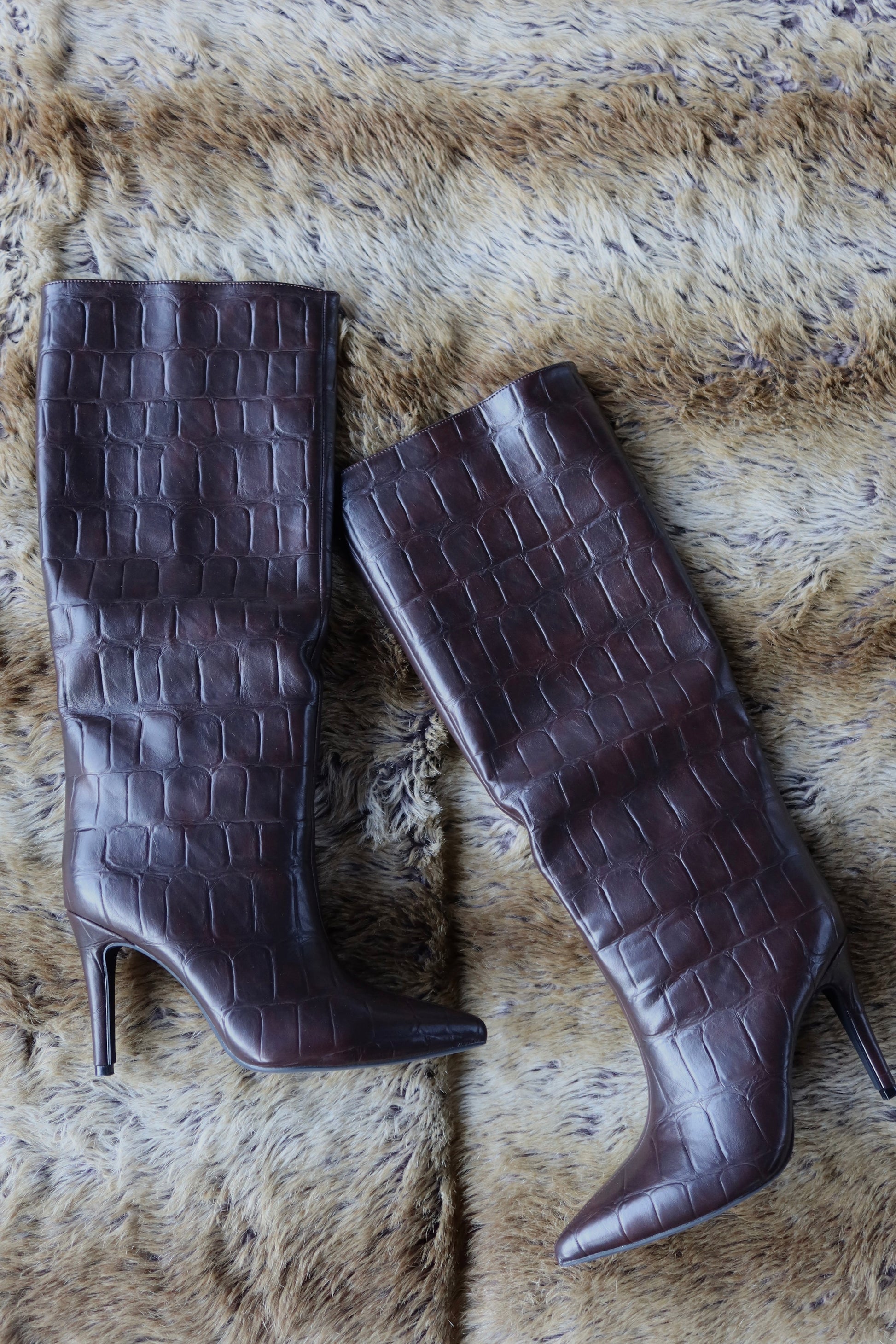 Stivale bellissimo non è stretto al polpaccio ,tacco 7 cm stampa coccodrillo marrone che va nel bordeaux.