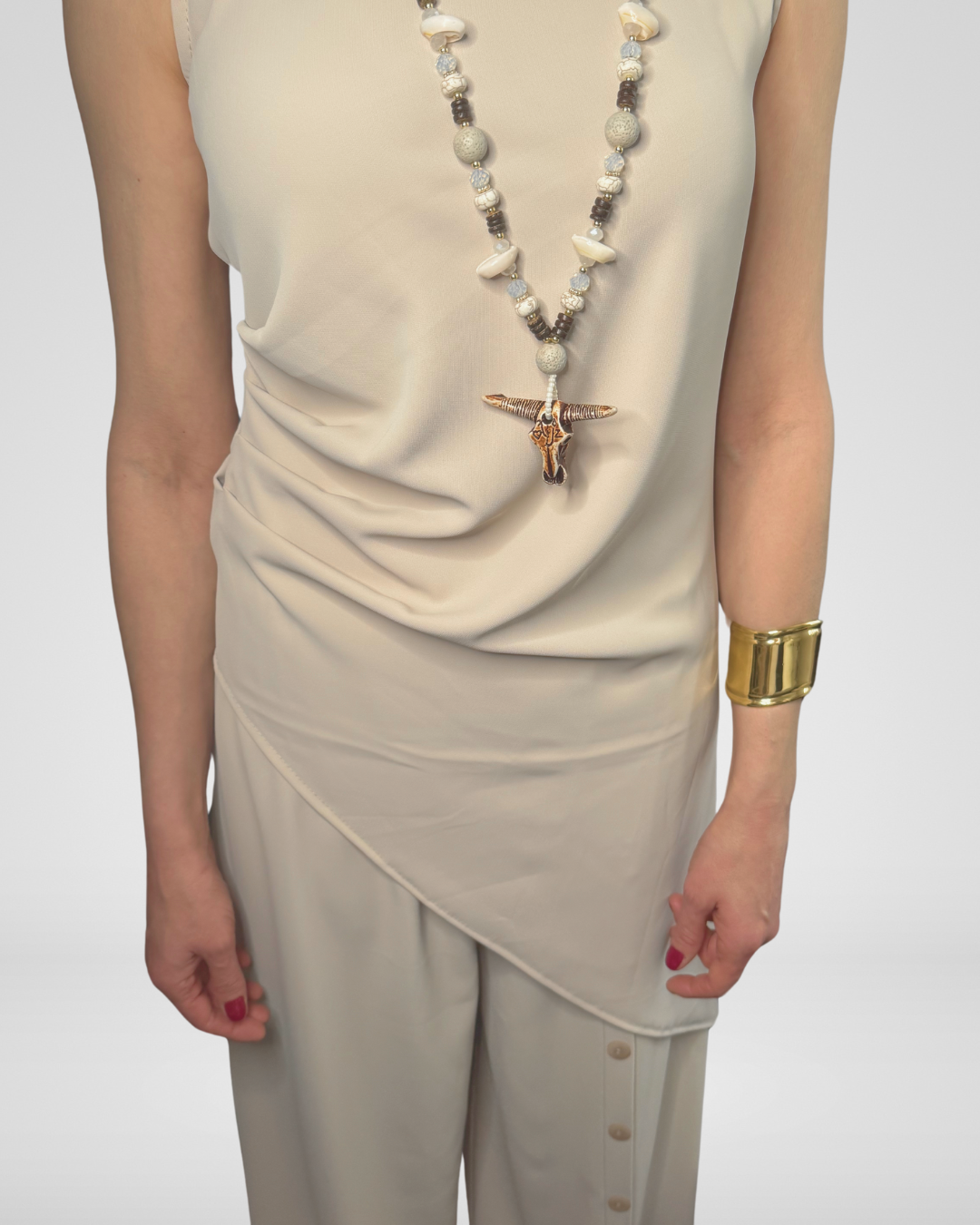 Un top asimmetrico con arricciatura laterale è un capo d’abbigliamento che combina eleganza e originalità. La sua caratteristica principale è la forma asimmetrica, che crea un effetto visivo interessante, con un lato più lungo rispetto all’altro. L’arricciatura laterale aggiunge un ulteriore elemento di stile, creando volume e movimento al tessuto, donando al top una silhouette dinamica e femminile.