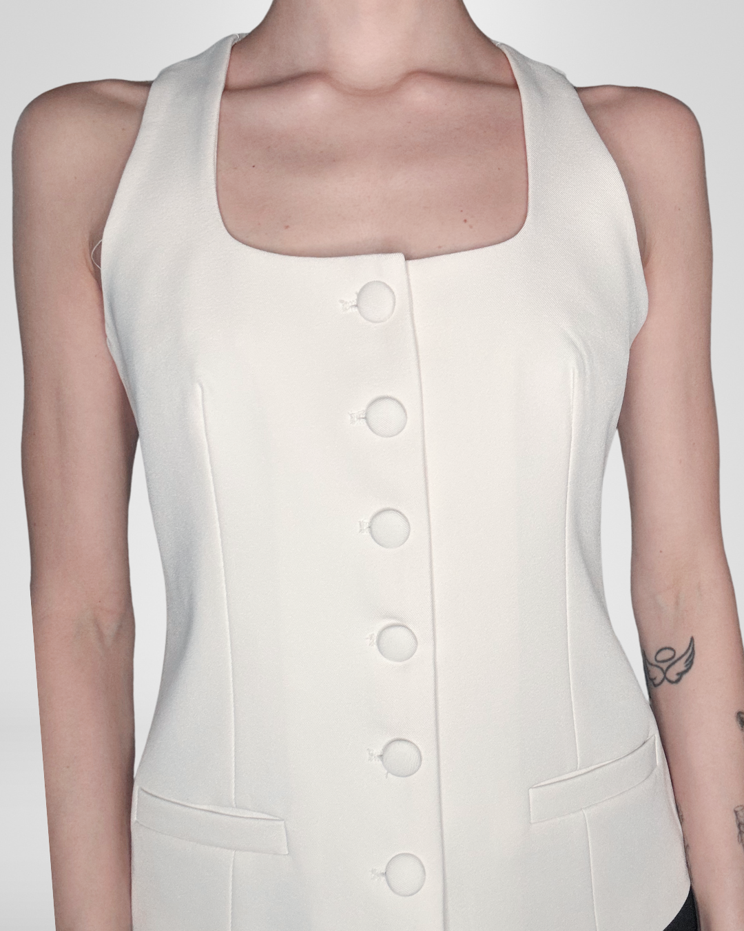 Un capo d’abbigliamento raffinato e versatile, perfetto per occasioni sia casual che più formali. La sua struttura semi-rigida offre un sostegno delicato, mentre il tessuto morbido garantisce comfort e libertà di movimento. I bottoni frontali non solo conferiscono un elemento di stile classico, ma permettono anche di aprire o chiudere il capo facilmente, rendendolo pratico e funzionale. Il fit regolare lo rende adatto a diverse silhouette, esaltando la figura senza costringere.