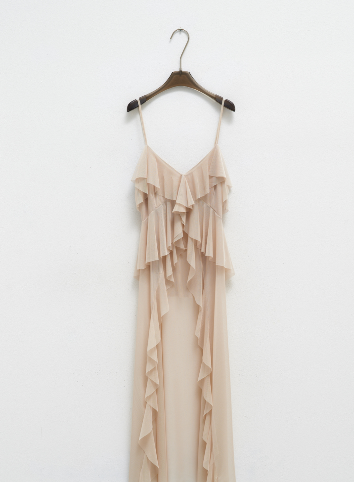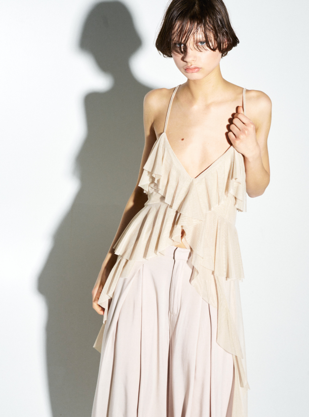 Un top elegante e femminile, caratterizzato da un design con volant morbidi e fluenti che creano un effetto delicato e romantico. La sua lunghezza è corta davanti, perfetta per mettere in risalto la silhouette, mentre sul retro presenta un velo leggero e trasparente che dona un tocco di raffinatezza e sensualità. Le balze morbide aggiungono movimento e volume, rendendo il capo ideale per look sofisticati o casual chic, perfetto per chi desidera un tocco di leggerezza e femminilità nel proprio outfit.