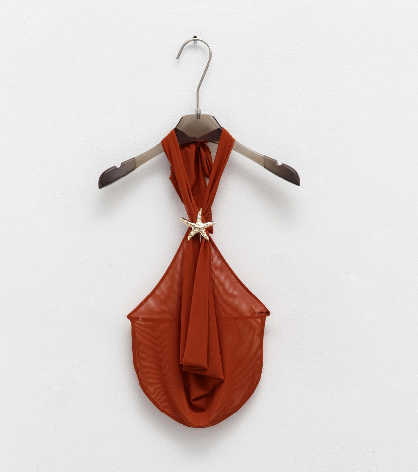 Top LUMINA halter regolabile in tulle con accessorio. Presenta trasparenza e apertura posteriore regolabile. Vestibilità regolare, disponibile in taglia UNICA.