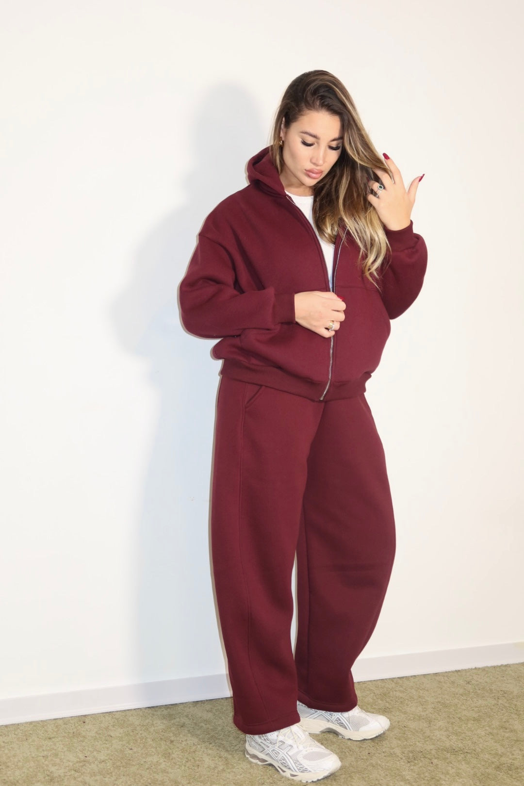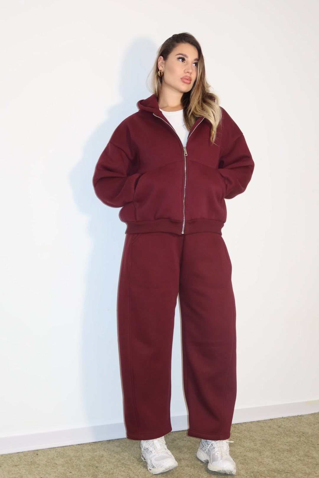 tuta just west composta da felpa con zip e cappuccio e pantalone leggermente ballon è taglia unica veste dalla xs-l
