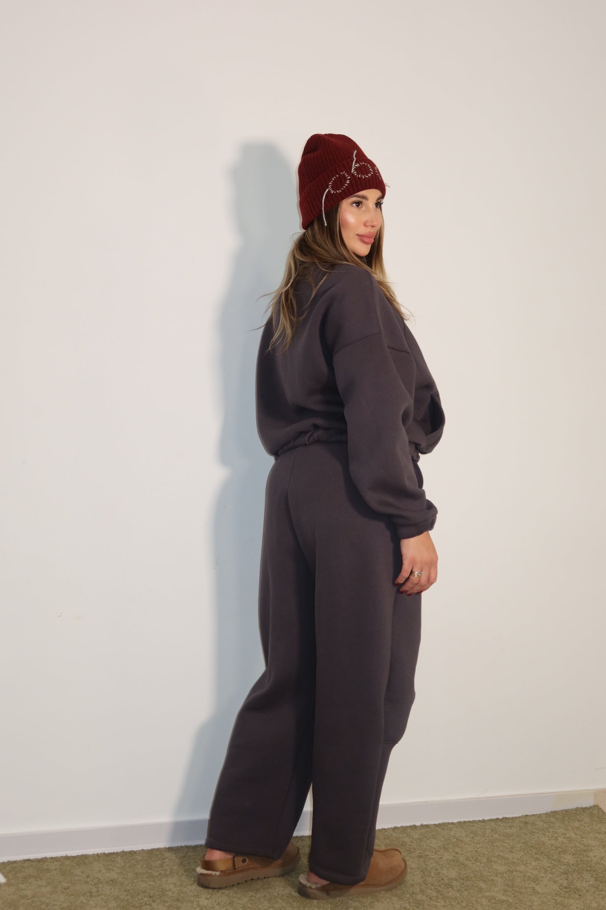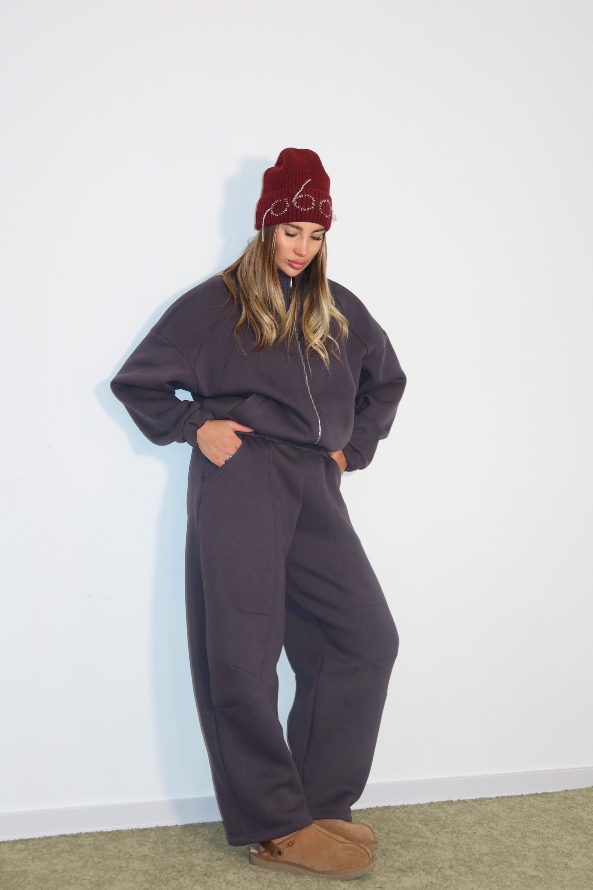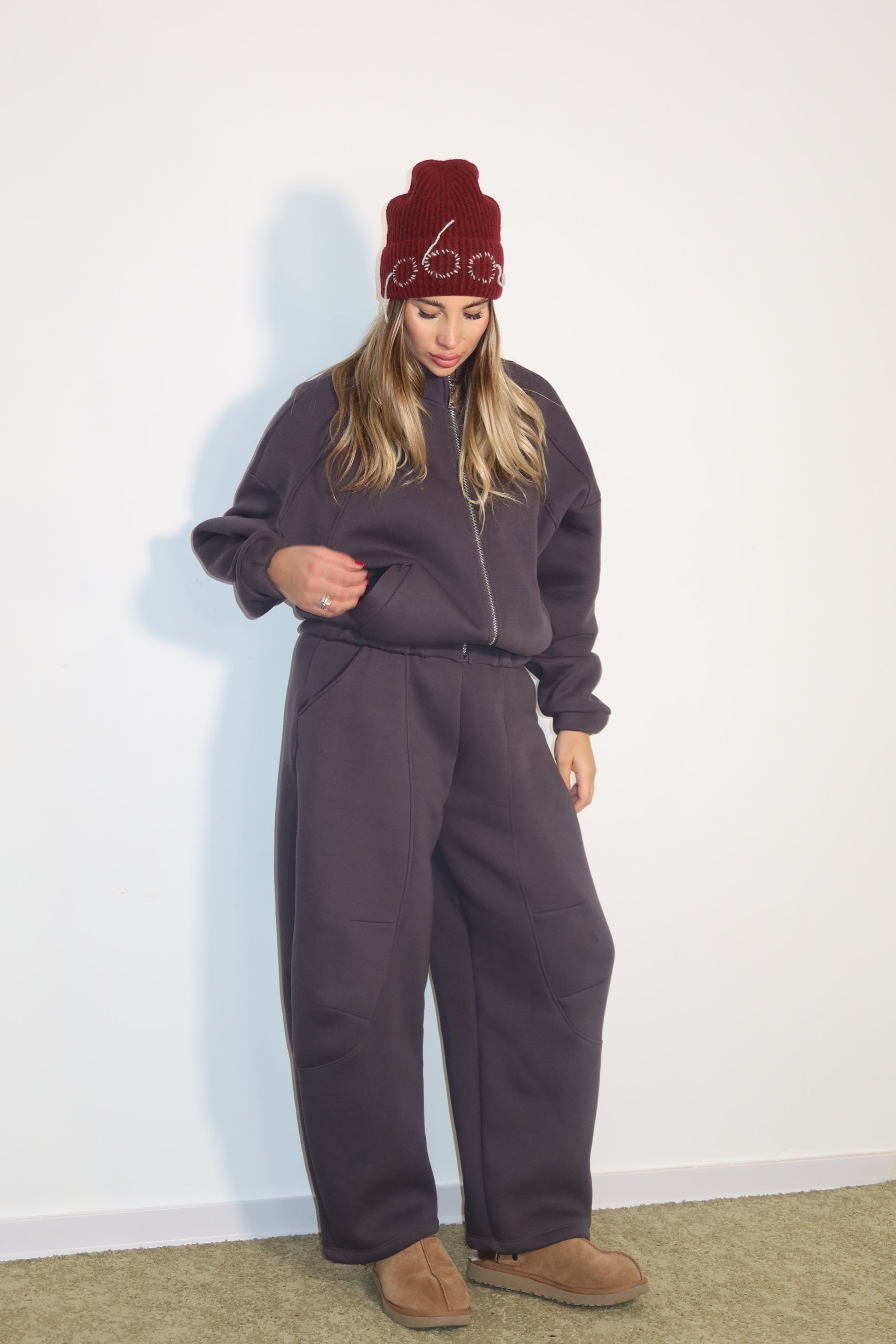la tuta ballon è composta da: felpa modello oversize con zip e ha un taglio morbido , Pantaloni ballon , con tasche grandi e cuciture evidenti sul davanti; vestibilità regolare .È taglia unica veste dalla xs-Xl